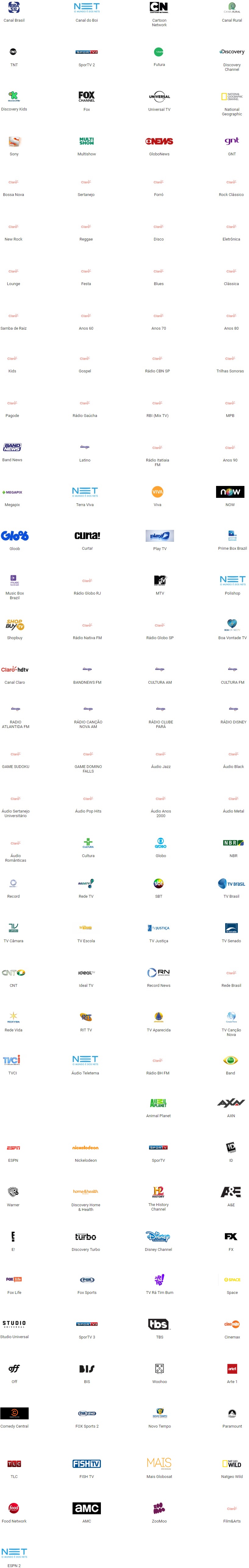 4. Curta!, Woohoo, Arte 1, Prime Box Brazil, Music Box Brazil e Play TV são canais brasileiros de espaço qualificado. Caso estes canais deixem de atender às exigências previstas na Lei 12.485/11 e/ou em quaisquer outros regulamentos existentes a respeito do tema, poderão ser excluídos da grade de programação da NET.